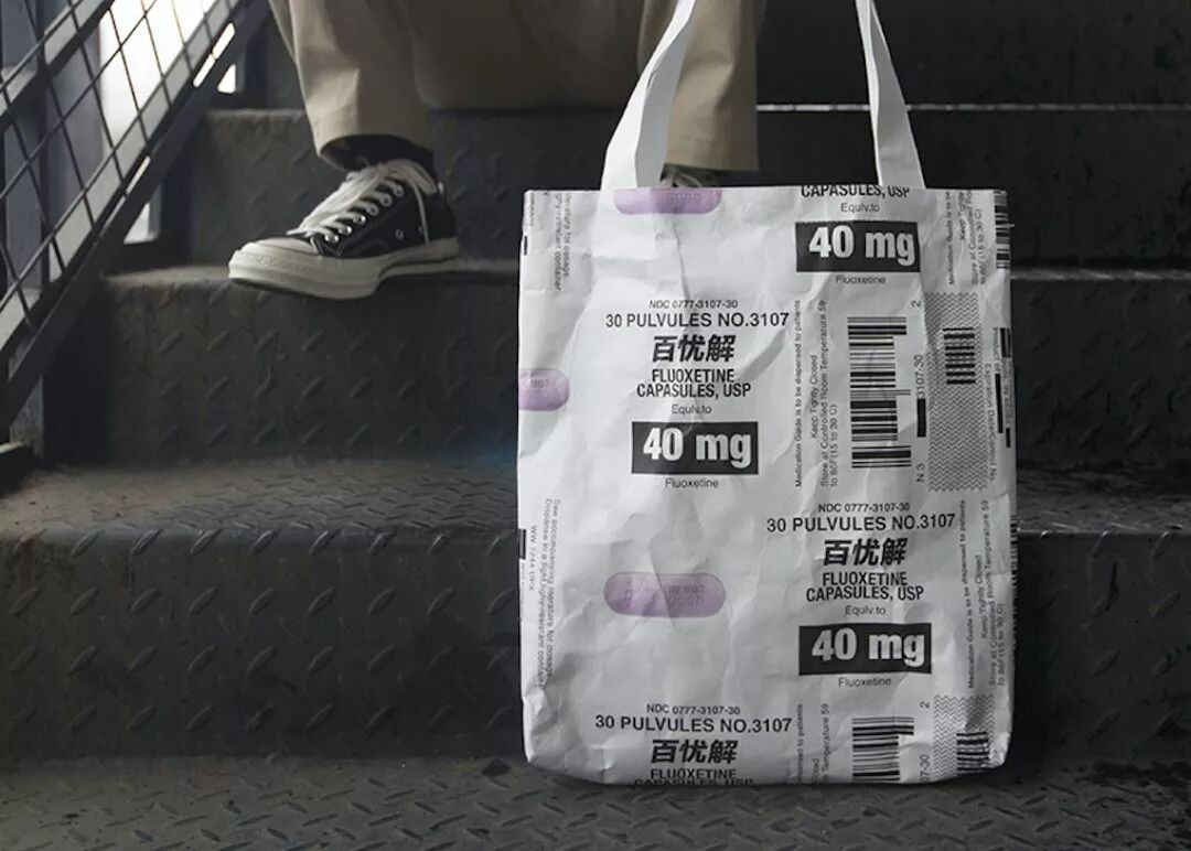 百忧解是一种抗抑郁的药物,设计师从网络“丧文化”提取关键信息,印刻在药丸图案上,表现年轻人对现实生活的一种自嘲态度。