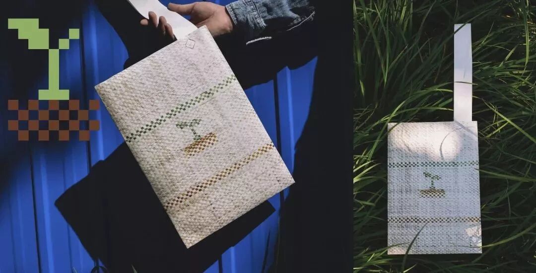 设计主要从编织袋材料质感印制到Tyvek® 材料上的冲突感和矛盾感入手,着重表现了编织袋的纹理与光泽,并从编织造成的格子肌理出发,创造像素风的图样。图样主要以轻松愉快与些许怀旧感为主。