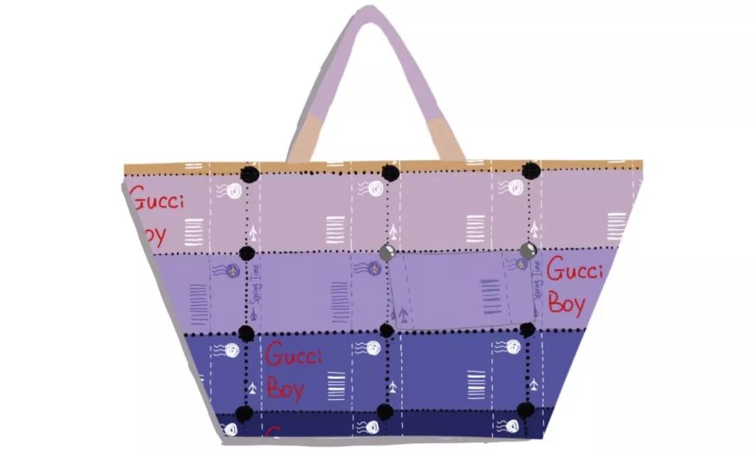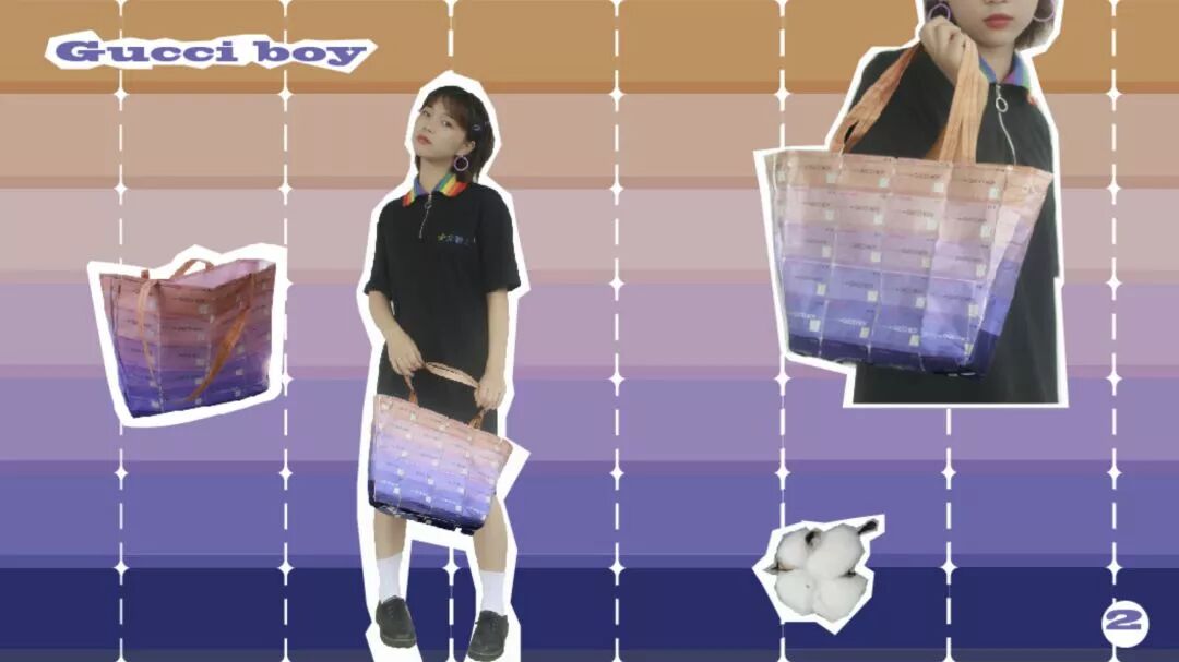 以邮票以齿空相连成为整体为设计思路,以当季流行色紫橙渐变为主要配色。这是由许多明信片相连组成的纹样,明信片记录着远方朋友祝福、思念和美好,而随着微信、QQ的冲击,越来越少人会想到写信,这是对从前那个很慢的时代的追念。而明信片上随机出现印有“Gucci Boy”的字符,是时下社会风气衍生出来的价值观,无论正确与否,都值得我们深思。