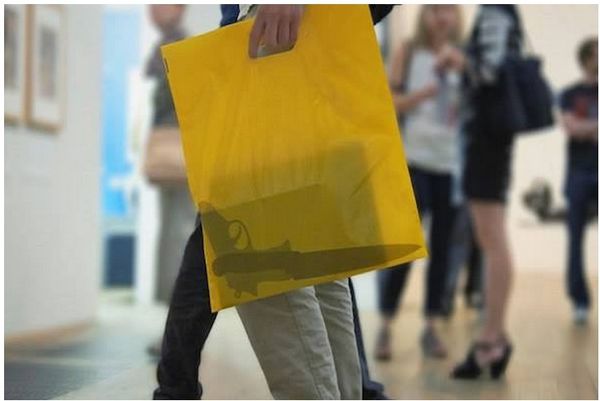他们在全黄色的购物胶袋上,印上危险物品的剪影,乍看一下,还以为袋子裡真的藏有了危险物,这种购物胶袋拿在手裡不但路人回头率高,还可能会莫明奇妙的惹来警察的监视。