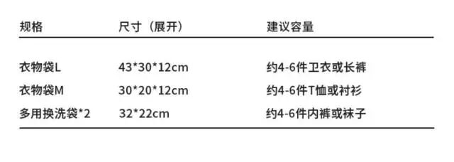 衣物袋M、衣物袋L、多用换洗袋*2。