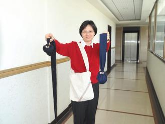 陈姝希说,「悠乐袋」的带子与球间以钮扣衔接,带子缩短时,也可当作按摩棒,解开钮扣后,带子跟球体就可分开,长带子可充当伸展带。球体展开后,就是一般的肩背包,外出购物时可当购物袋,因为兼具运动及日常生活的便利功能,所以称之为「悠乐袋」。