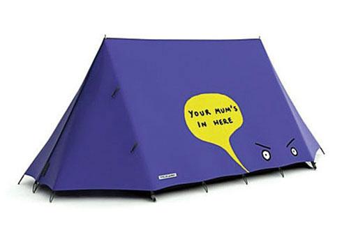 这款帐篷上写了一个标语:“你妈在这儿!”,虽然粗鲁,但对偷窥者是一个警告。