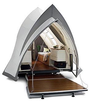 以下我们展示一些帐篷。这些可充气帐篷的前身是棱角分明的楔形帐篷。如今,楔形帐篷被升级改造成流线造型帐篷,在大风吹袭下,这类帐篷的稳定性比较高。
